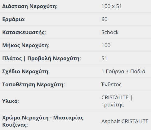 Νεροχύτης granite ένθετος MANHATTAN CRISTALITE 100×51 με 1 γούρνα και πάγκο εργασίας για ερμάριο 60 εκ., SCHOCK Γερμανίας