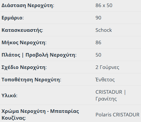 Νεροχύτης granite ένθετος MONO CRISTADUR 86×50 με 2 γούρνες για ερμάριο 90 εκ., SCHOCK Γερμανίας