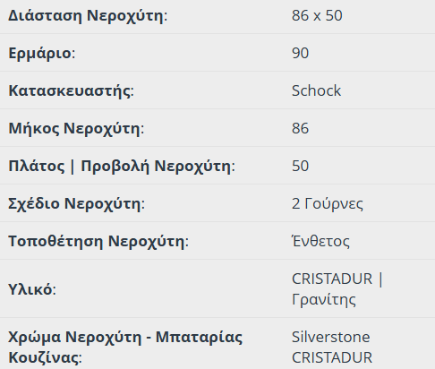Νεροχύτης granite ένθετος MONO CRISTADUR 86×50 με 2 γούρνες για ερμάριο 90 εκ., SCHOCK Γερμανίας